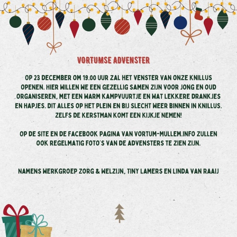 Op 23 december om 19.00 uur zal het venster van onze Knillus openen. Hier willen we een gezellig samen zijn voor jong en oud organiseren, met een warm kampvuurtje en wat lekkere drankjes en hapjes. Dit alles op het plein en bij slecht weer binnen in Knillus.