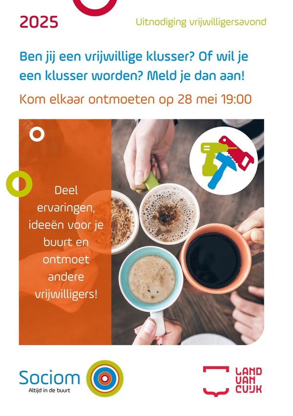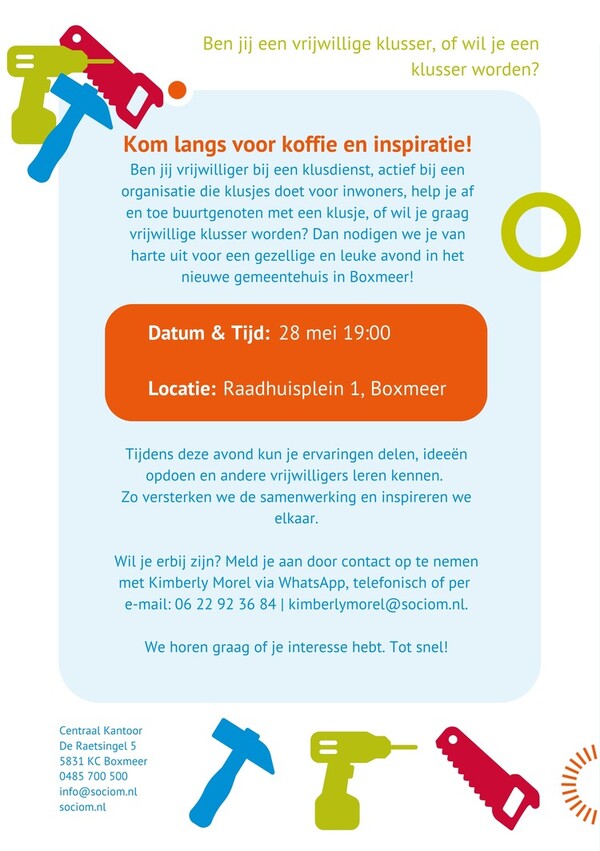 Sociom organiseert een gezellige en leerzame avond voor vrijwilligers die klusjes doen voor anderen. De bijeenkomst is voor iedereen die actief is bij een klusdienst, af en toe helpt bij kleine klussen, of vrijwilliger wil worden.