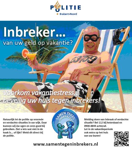 Terwijl veel mensen vakantie vieren in binnen- en buitenland, slaat het dievengilde toe. De politie waarschuwt dat inbrekers doelgericht op zoek gaan naar woningen, waar duidelijk niemand thuis is. Bij twijfel gaan ze eerder een straatje verder. Ook wanneer er onlangs bij u in de straat ingebroken is, loopt u meer risico om het volgende slachtoffer te worden. U doet er goed aan uw woning goed af te sluiten en een bewoonde indruk achter te laten.