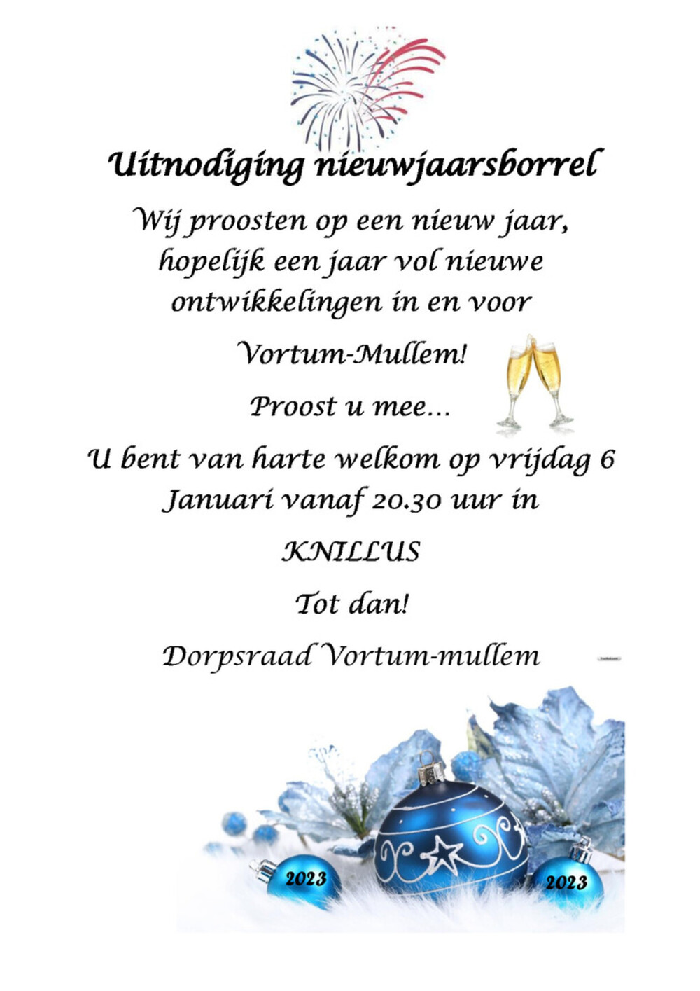 Dorpsraad Vortum-Mullem nodigt alle inwoners van Vortum-Mullem uit om samen het glas te heffen op 2023.