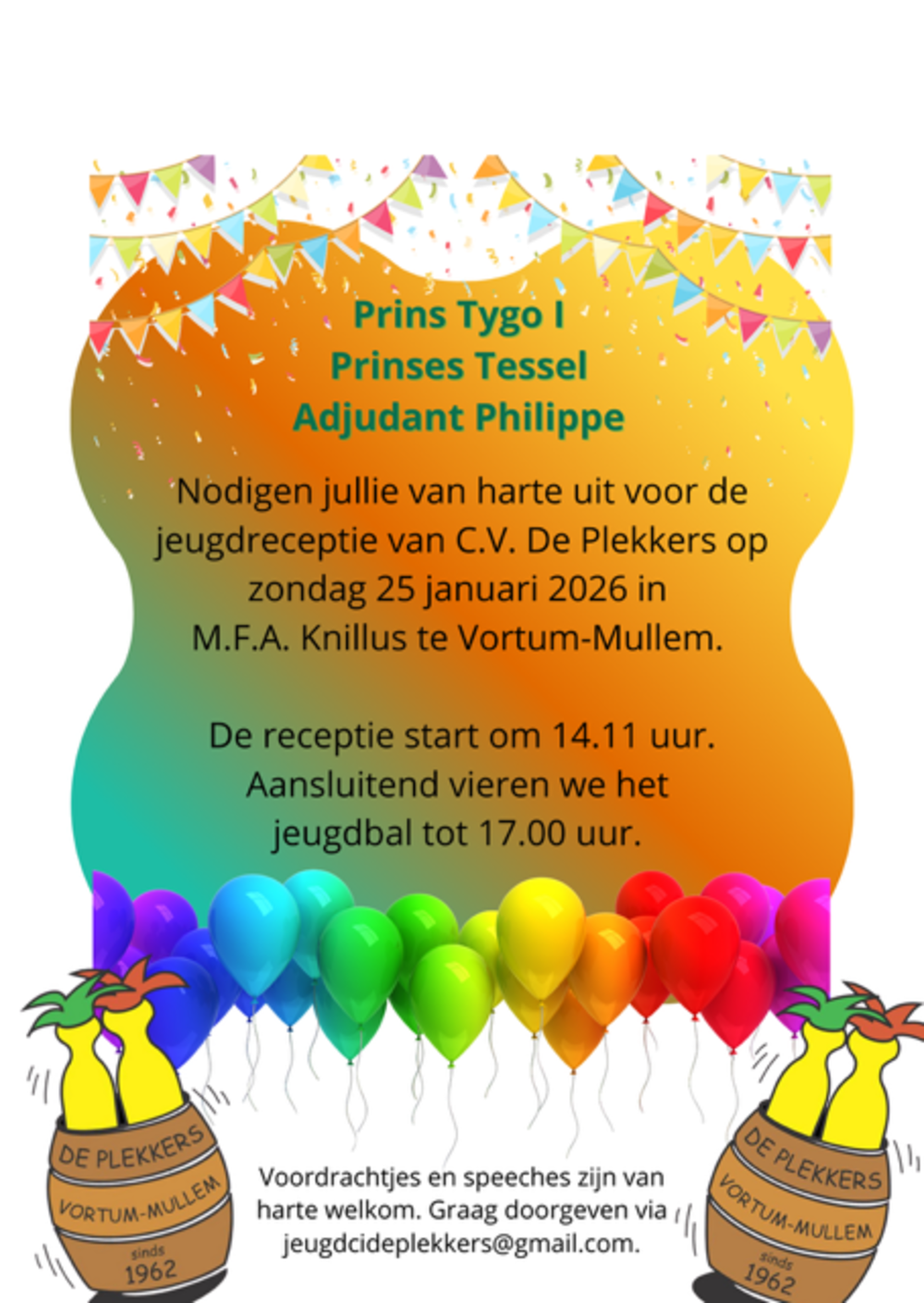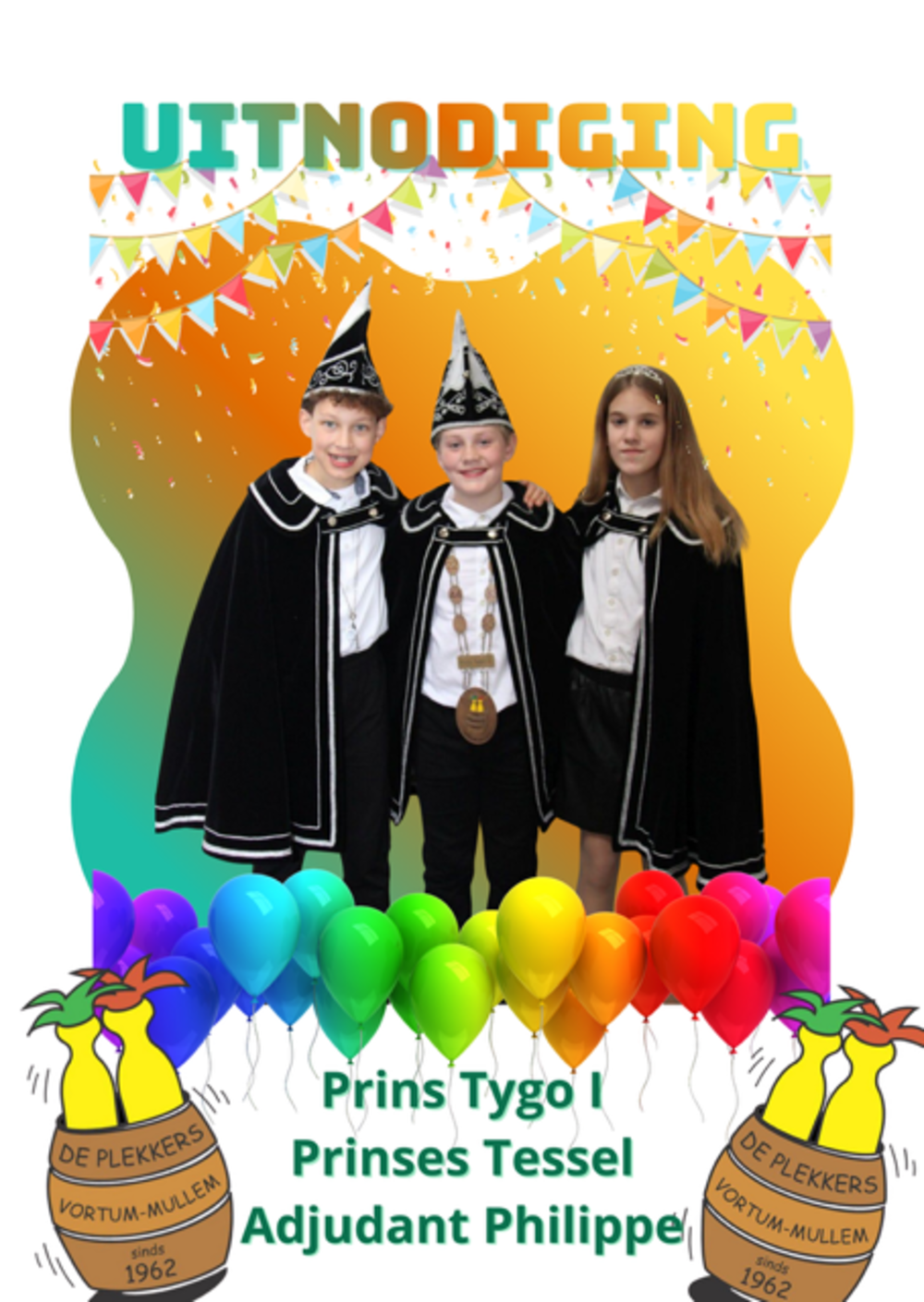 Met trots nodigen Prins Tygo I, Prinses Tessel en Adjudant Philippe jullie van harte uit voor de jeugdprinsenreceptie van C.V. De Plekkers.